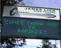 A. Karyn Neujahr, Lick’s Activities Director, says that it’s her responsibility to keep the sign updated. She inputs the information into her laptop and sends it over her telephone line to the sign. Unfortunately, her office is on the back side of the school – far from the sign - and it’s a long way for her to walk over to the sign to see if it’s displaying what she wants it to say. So, she tucks her laptop under her arm and goes over to Rafiki’s office and connects using their fax telephone line to convey the changes to the sign. This way, she can just pop out of Rafiki’s office and look out their west window to view the sign. Much more convenient than making the trek back and forth multiple times to see if the information she’s sending to the sign is properly displayed.