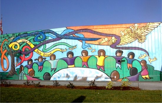 This bright mural celebrates diversity, community and noble conduct