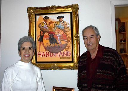 Lily and Rudy with framed enlargement of the cover illustration of Rudy’s book, Hand to Hand