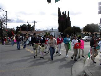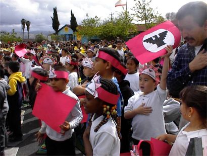 Kids and parents marched from distant schools to Chavez school on Kammerer Avenue