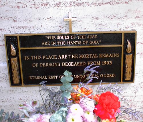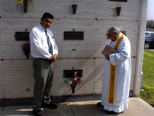 Cemetery General Manager Carlos Rascon and Monsignor Melani flank the newly sealed tomb
